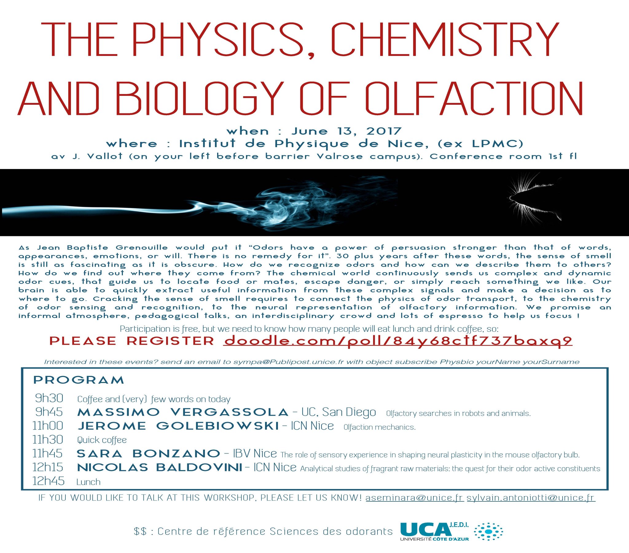 Le 1er atelier de travail sur l’olfaction pour les physiciens, pharmaciens et biologistes aura lieu le 13 juin 2017 à l'Institut de Physique de Nice (INPhyNI) (LPMC) à Valrose. Plus d'informations