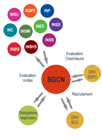 Plaque tournante de l'organisation du travail des Sections, le SGCN travaille principalement en coordination avec les 10 instituts du CNRS, pour l'évaluation des chercheurs et des unités, le Service Central des Concours et le Service du Développement Professionnel Chercheurs, au sein de la Direction des Ressources Humaines. Le SGCN interagit avec les Délégations Régionales pour tout ce qui concerne les missions des membres
