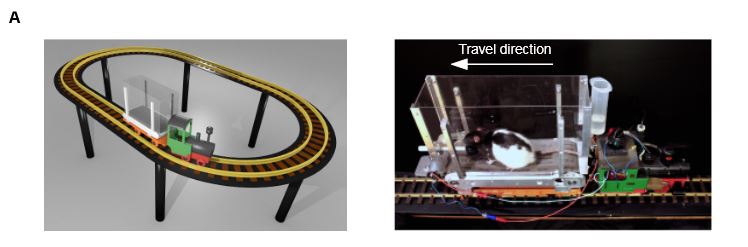 Which of these sequences, slow or nested, is necessary for the appearance of sequence reactivations, and therefore causes the consolidation of memories during sleep? Using an ingenious system, the researchers discovered what deactivates nested sequences, without affecting slow sequences: the animals are transported on an electric train, in a car with a treadmill (see image). When the treadmill is stopped, the nested sequences disappear; they return when the treadmill starts again.