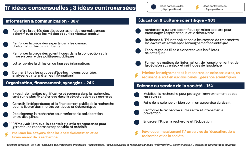 Antoine Petit explains that this massive participation "testifies to French people's interest in science, their conviction that it's useful for society and their attachment to public research". This is indeed the message that emerges from the proposals made. Make.org grouped the proposals into 17 consensual ideas and 3 controversial ideas and classified them into 4 themes (see box for methodology).
