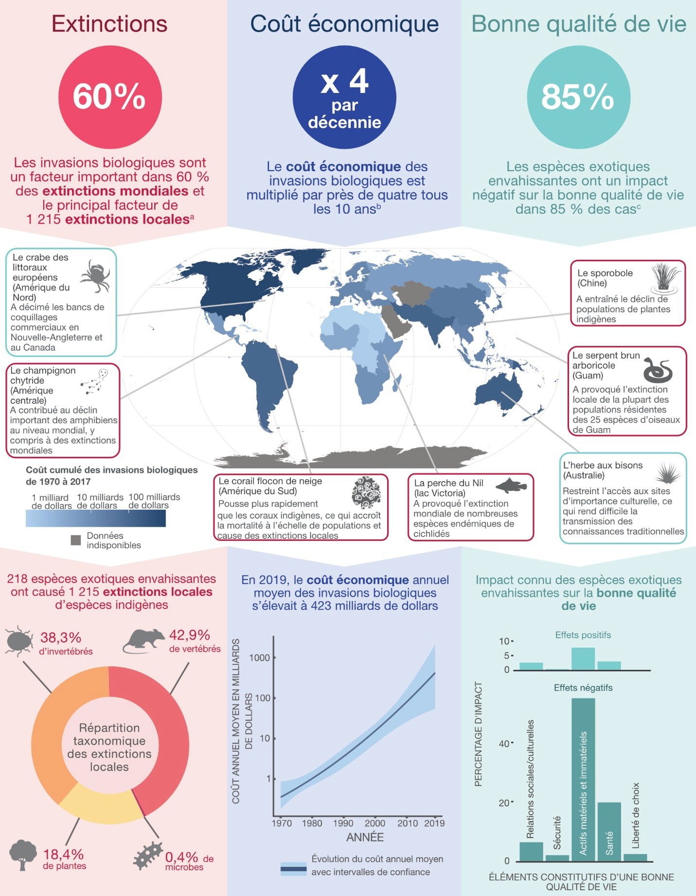 Le rapport indique que 60 % des extinctions d’espèces sont dues à des invasions biologiques et que leur coût environnemental va être multiplié par quatre tous les dix ans si la situation stagne, alors que, dans les faits, elle empire. 85 % des espèces exotiques invasives auront alors un impact négatif sur notre qualité de vie. Enfin, nous soulignons que de nombreuses espèces envahissantes n’ont pas encore été déclarées comme telles, notamment par manque de données évaluées par les pairs dans certaines régions du monde moins bien étudiées sur le plan scientifique.