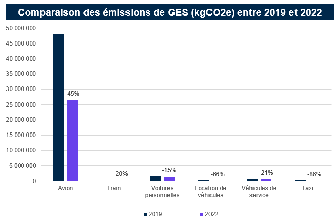Toutefois, la réduction la plus significative touche les déplacements professionnels (6 % du BEGES). Et pour cause : les déplacements aériens, moyen de transport le plus émetteur de gaz à effet de serre, ont chuté de moitié entre 2019 et 2022. Cette baisse spectaculaire s’explique à la fois par des raisons conjoncturelles – la pandémie de Covid-19 ayant contraint la fermeture de nombreux pays, notamment asiatiques – et par des raisons plus structurelles de changement de pratiques individuelles et collectives : réduction du nombre de participation physique à des conférences internationales et recours accru à des systèmes de visioconférence facilitant les interactions, recours au train pour les déplacements en Europe. De fait, on observe dès à présent au CNRS un report modal de l’avion vers le train, qui voit sa fréquentation augmenter de 6 % entre les deux BEGES. Bien au fait de ces changements de pratique en vertu de son poste de travel manager à la direction déléguée aux achats et à l’innovation du CNRS, Jean-Luc Marchon note le caractère pionnier de l’établissement : « Le CNRS a été le premier client de son titulaire de marché à lui avoir demandé d’intégrer à son outil de réservation en ligne les règles de politique voyages découlant du plan de sobriété énergétique de l’État en direction d’une trentaine de destinations françaises et européennes les plus fréquentées par ses agents, ce qui sera opérationnel au printemps 2025. En trois mois, il a été la première entreprise publique à s’être aussi finement et rapidement conformée à la nouvelle règlementation en retirant de l’outil les destinations en avion réalisables en moins de 4h en train ».