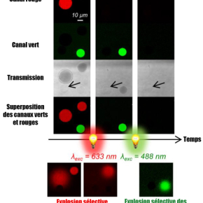 Observations au microscope confocal de trois types de vésicules. En rouge, celles remplies de bleu de méthylène, en vert celles de calceine et, pour celle indiquée par une flèche, de sucrose. Une irradiation par laser de 633 nm puis de 488 nm fait successivement éclater les vésicules rouges et la verte. L'autre vésicule reste intacte.