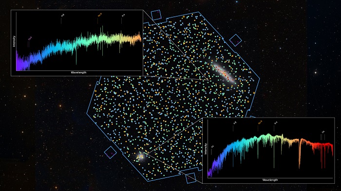 La première lumière de 4MOST montre tout le potentiel de l’instrument, capable d’observer un large champ tout en pouvant analyser simultanément plusieurs milliers d’objets astronomiques (fig. 3). Parmi les observations les plus remarquables figurent la galaxie du Sculpteur (NGC253), la plus grande du ciel austral après les deux nuages de Magellan. Son diamètre apparent équivaut à celui de la Lune mais sa luminosité plus ténue la rend beaucoup moins visible.