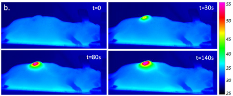 Images infrarouges d'une souris anesthésiée lorsque sa tumeur, injectée de nanotubes, est exposée à un laser. L'échelle de droite représente la température en surface.