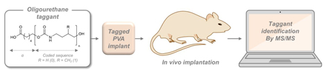 Les polymères encodés ont été incorporés dans des implants en alcool polyvinylique, qui ont été implantés dans des rats. Après un temps d'incubation in vivo, les implants sont retirés. La spectrométrie de masse permet alors d'identifier le polymère marquant chaque implant.