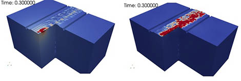 Amplitude du champ de déplacement après le passage d'un train sur la voie. La figure de gauche correspond à une simulation avec ballast homogène et celle de droite à une simulation avec ballast hétérogène.